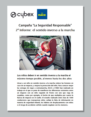 Los niños deben ir en sentido inverso a la marcha el máximo tiempo posible, al menos hasta los dos años. Llevar a un niño en sentido inverso a la marcha reduce las lesiones en caso de un impacto, y mejora la protección del niño. Para conocer mejor las ventajas de viajar a contramarcha, RACE y CYBEX han realizado un trabajo en el que se pone de manifiesto las diferencias existentes entre un impacto con un niño viajando de frente con uno que viaja de espaldas, como por ejemplo, el hecho de que multiplica por cuatro la fuerza de impacto en el cuello. El estudio realizado entre más de 1000 conductores que transportan niños señala la falta de información en materia de seguridad infantil, los hábitos de desplazamiento con niños o el riesgo de accidente sufrido cuando viajaban con los menores.