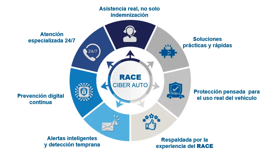 RACE Ciber Auto es una póliza de ciberseguridad para vehículos de hasta 3.499 kg conectados que te protege frente a: