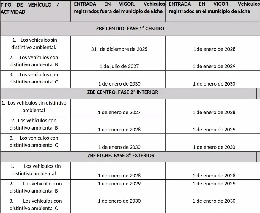 Los primeros afectados son los vehículos sin distintivo ambiental. En la zona centro, los vehículos registrados fuera de Elche son los primeros en verse afectados y tienen restringido el acceso desde finales de 2025, mientras que los empadronados en el municipio mantienen el acceso hasta el 1 de enero de 2028. En las zonas interior y exterior, estas restricciones se aplican más adelante, con fechas que se sitúan entre 2027 y 2028.